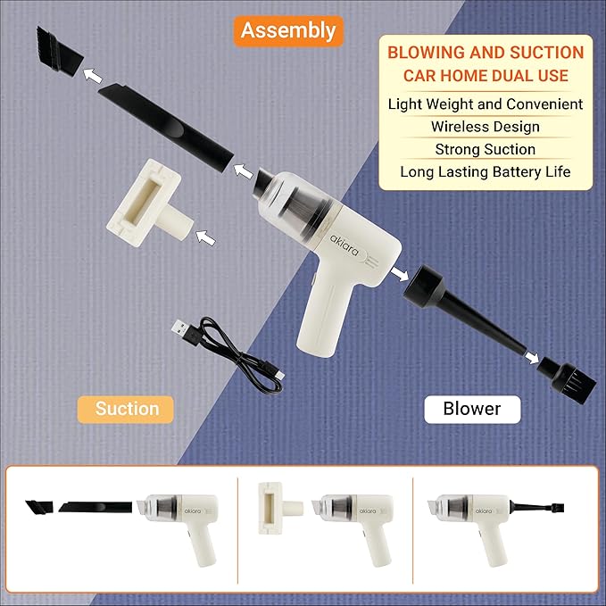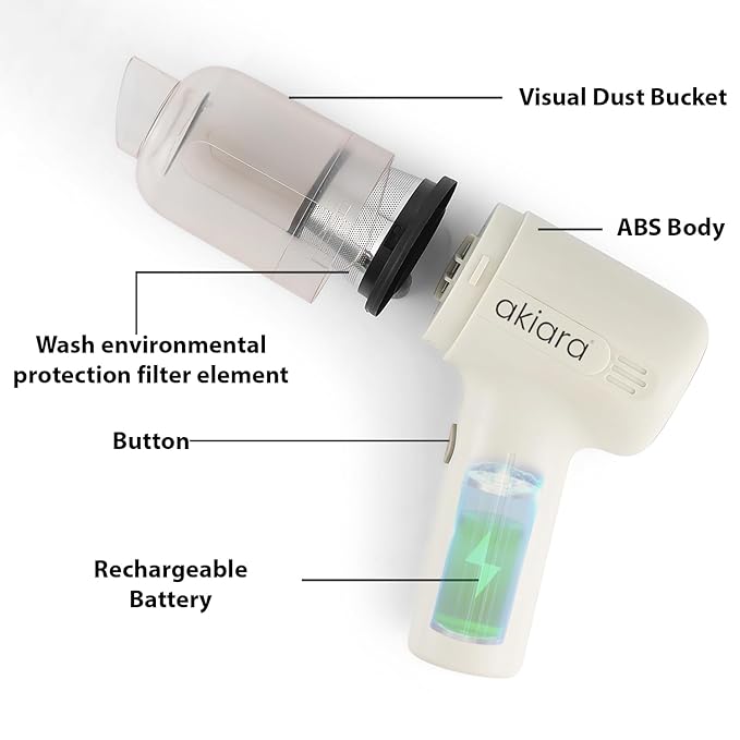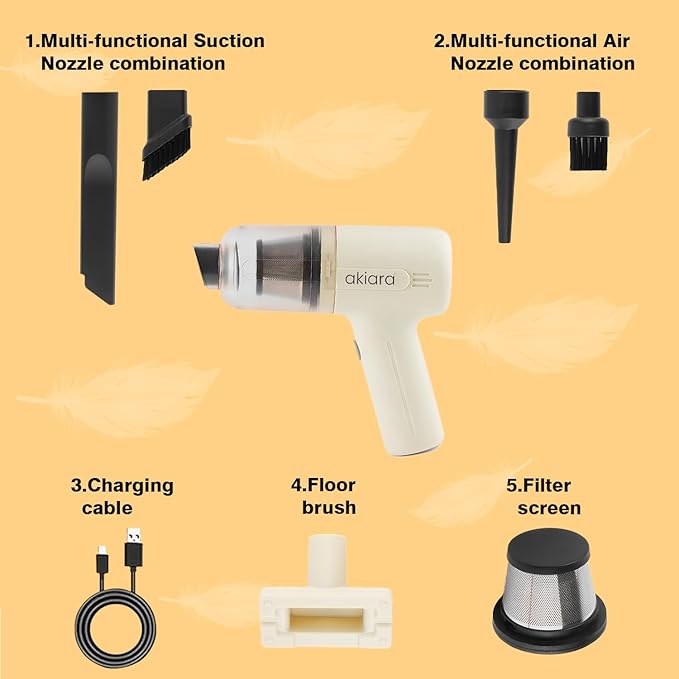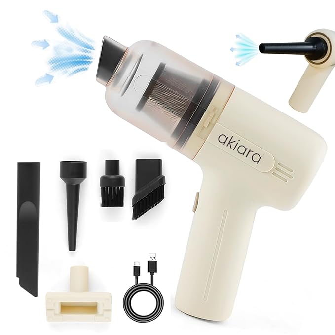 Introducing Akiara’s cordless handheld vacuum cleaners, revolutionizing home and automobile vacuum cleaners with powerful suction and HEPA filter technology. With a 1-hour runtime, compact 17L x 20W x 7H cm size, and 120-watt performance, they’re perfect for all floors. Transition effortlessly from home to car cleaning with this wireless handheld car vacuum cleaner, including targeted solutions for beds and sofas. Elevate your cleaning experience with Akiara’s innovative cordless and automobile vacuum cleaners.