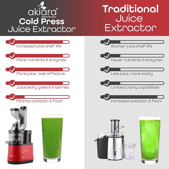 Effortlessly juice, blend, and grind fruits, vegetables, and nuts with Akiara's cold press juicer. Enjoy nutrient-rich, healthier juice thanks to low-speed squeezing that preserves vital vitamins and minerals. This versatile slow juicer cold press system uses pure natural technology that mimics hand-squeezing for fresh, additive-free juices, smoothies, and nut milk — just like cold pressed juice delivery at home.