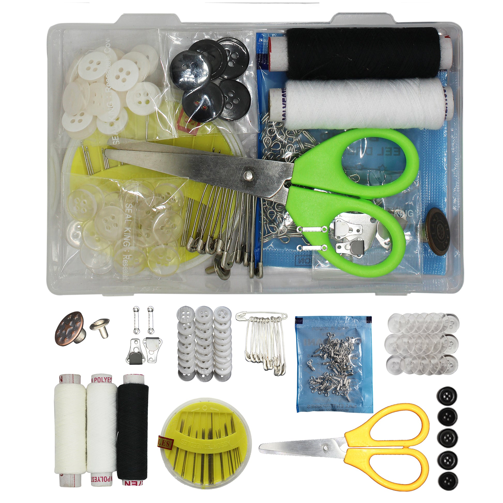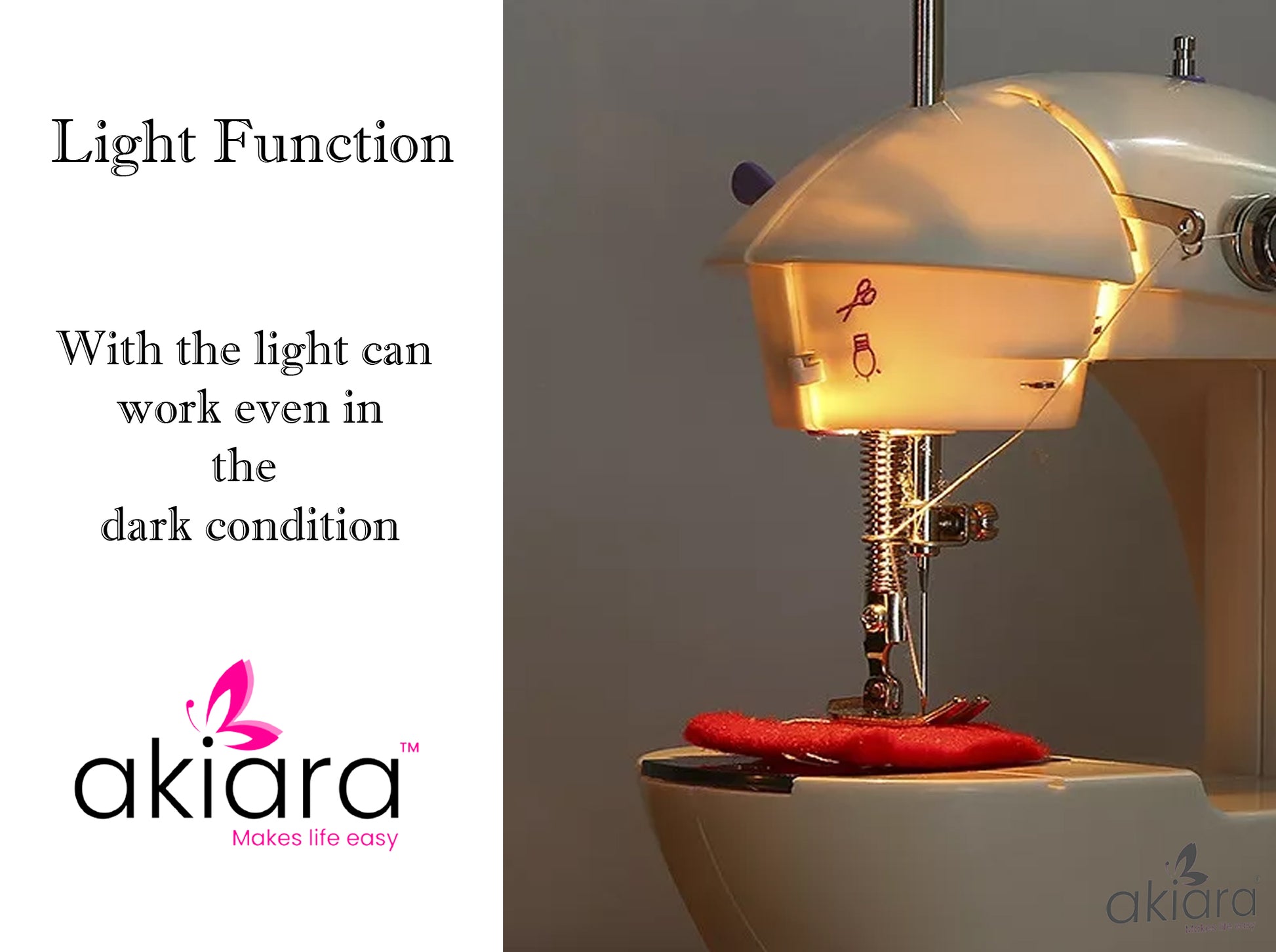Akiara Mini Sewing Machine Kit includes everything you need: 1 Mini Sewing Machine, Foot Pedal, AC/DC Adapter, 4 Bobbins, Extra Needle, Thread Cutter, Needle Threader, 3 Color Threads, 24 Needles, Scissors, Safety Pins, Buttons, and more.